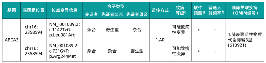 ABCA3基因的致病性变异可导致呈常染色体隐性遗传的肺表面活性物质代谢障碍3型(Surfactant metabolism dysfunction, pulmonary, 3,SMDP3)。SMDP3主要临床表征包括新生儿严重呼吸困难/呼吸衰竭、呼吸窘迫、肺泡蛋白质沉积症、肺泡内充满颗粒状或泡沫状表面活性剂蛋白渗出物、II型肺细胞增生、剥脱性间质性肺炎、X光片显示颗粒状/模糊的磨玻璃样间质混浊等,患者通常出生时就发病,大多数受累婴儿在出生后的第一个月死亡。