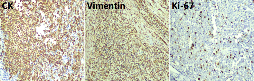 阳性:CK、Vimentin、Ki-67(约15%+)。