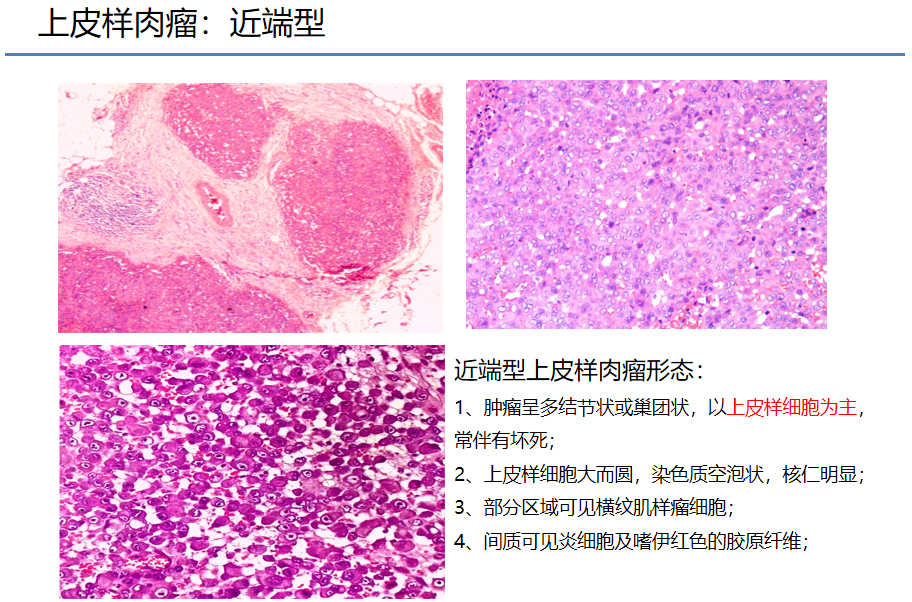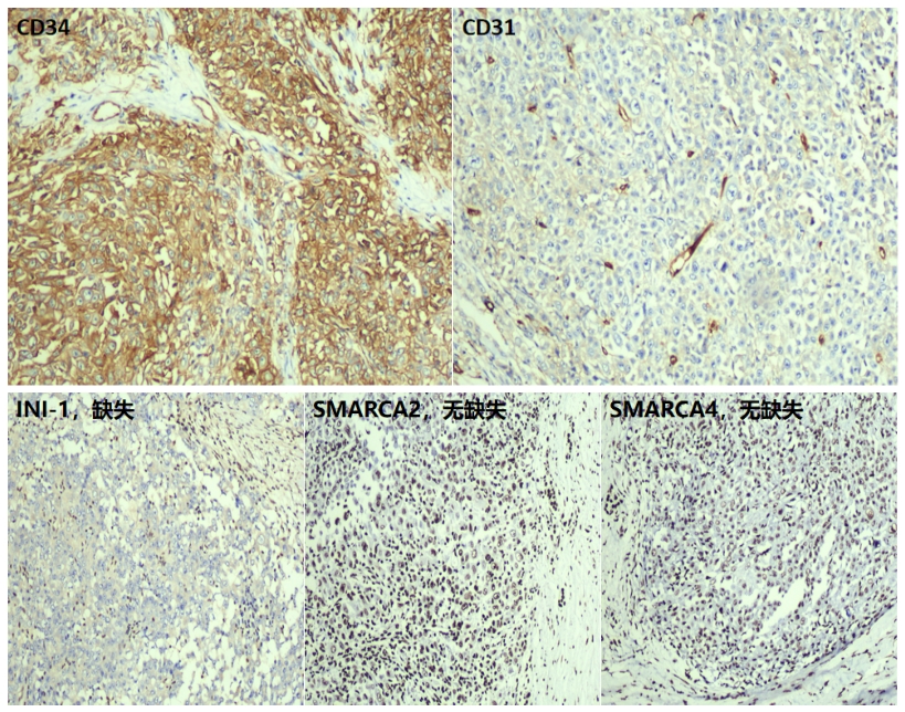 上皮样肉瘤可表达上皮(CK、EMA等)及间叶(Vimentin)的标记,约半数可表达CD34,但不表达CD31,并且大于90%的上皮样肉瘤会出现INI-1/SMARCB1缺失。近年来,也有发现INI-1保留的上皮样肉瘤,但可能显示具有SWI/SNF复合体其他亚基的突变,特别是年龄较大的患者:如:SMARCA4、SMARCC2、SMARCC1丢失等。