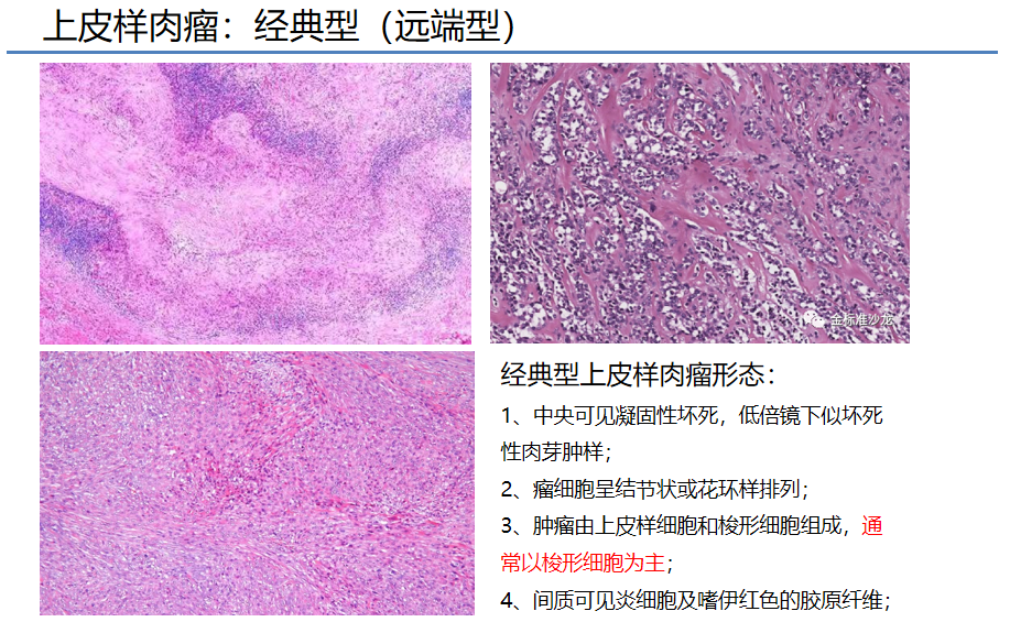 上皮样肉瘤(ES)由多边形上皮样细胞混合数量不等的梭形细胞组成,胞浆呈深嗜伊红色,瘤细胞常呈结节状和花环样排列,结节中央可见坏死、出血或玻璃样变性。