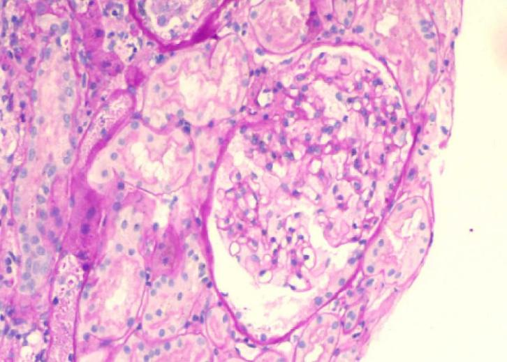毛细血管襻开放,基底膜无明显增厚,未见钉突样结构,无系膜插入及双轨形成,上皮下、内皮下无明显嗜复红蛋白沉积,壁层上皮细胞无明显增生,未见新月体形成;