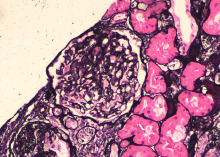 PAS×200 肾小球上皮细胞肿胀伴空泡变性、泡沫细胞形成