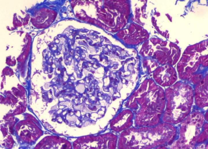 Masson×200 肾小球上皮细胞肿胀伴空泡变性、泡沫细胞形成