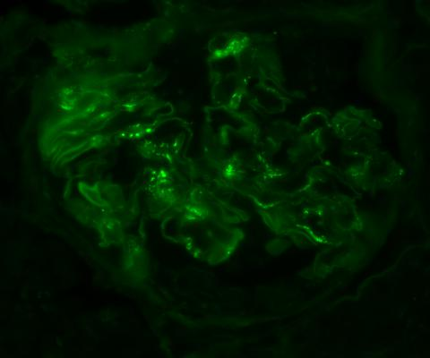 荧光下可见IgA(1+)系膜区颗粒状沉积