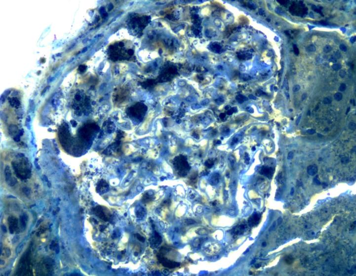 电镜标本经甲苯胺蓝染色,可见1个肾小球,可见嗜甲苯胺蓝颗粒在足细胞、小管上皮细胞以及壁层上皮细胞多部位沉积;