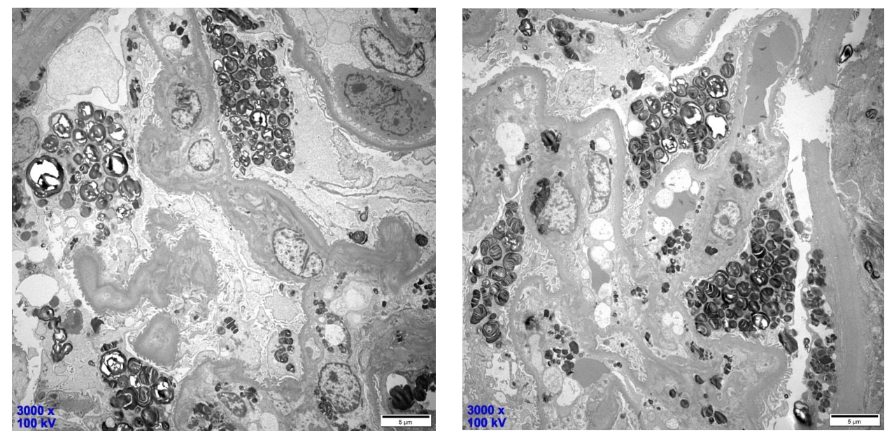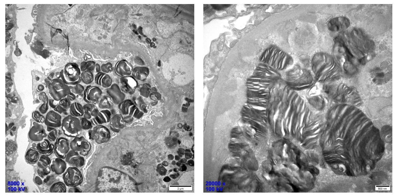 »在高放大倍率下,GL-3沉积物由电子致密的多层同心层组成,3.5至5nm具有诊断意义,可见足细胞内大量分层环状的髓磷脂样小体(又称髓样小体)。