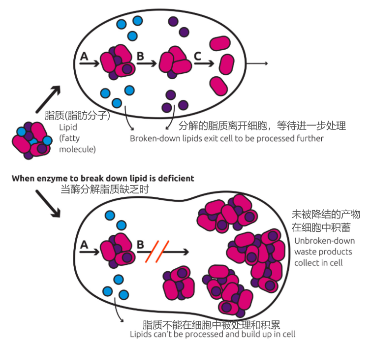 »在不同细胞类型的溶酶体内观察到GL-3沉积物称为“髓鞘图”、“洋葱皮”或“斑马体” 。