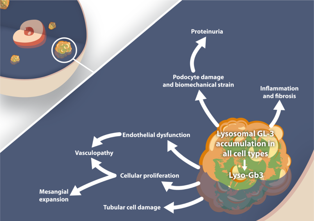 发病机制:该病以X伴性方式遗传,其发病与位于X染色体长臂q22.1(Xq22.1)的 GLA 基因(编码 α-GalA)突变有关,基因突变导致α-GalA酶的活性降低,引起其代谢底物神经鞘脂类化合物(绝大部分为三己糖酰基鞘脂醇,Gb3)在各种细胞或组织溶酶体中不断蓄积,引起细胞增殖、肿胀,导致全身多脏器受累而表现出多种多样的临床表现。目前为止已有数以百计的GLA基因突变可引起该病。