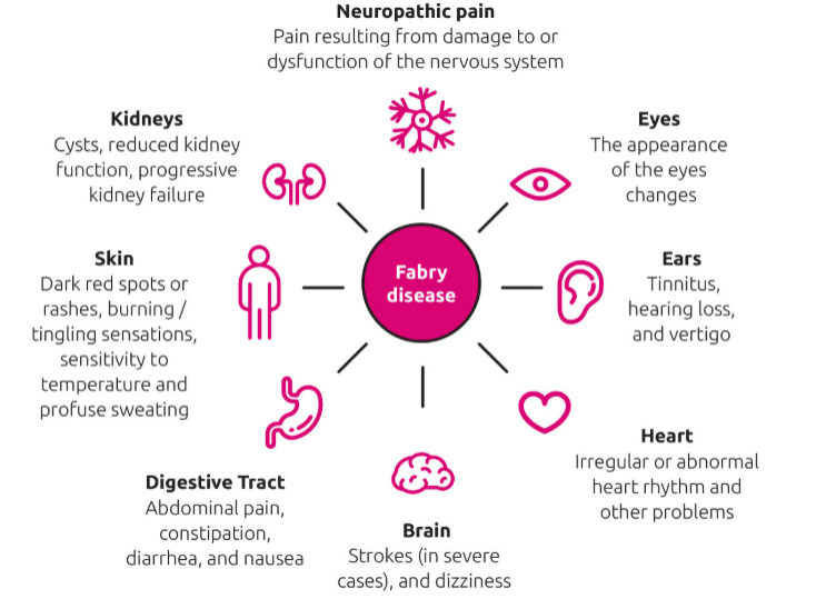 Fabry病常很难被诊断,常常未被发现或误诊。它的症状是非特异性的,包括手足疼痛、皮肤皮疹、消化系统问题等早期症状,以及肾病、心脏病或中风等严重后果。